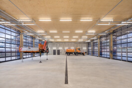 Die Gebäudehöhe passt sich der Hanglage an und fügt sich in die Umgebung ein. Die Fassade aus unbehandeltem Lärchenholz verleiht dem Bau eine natürliche, in die Landschaft eingebettete Optik. Innen dominieren sichtbare Beton- und Holzoberflächen, die den Ausbauaufwand minimieren, kombiniert mit farbigen Linoleumböden. Auch die temperierte Fahrzeughalle, ausgestattet mit großflächigen Verglasungen, bietet helle und funktionale Arbeitsplätze.