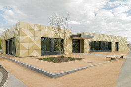 Das im Innenraum präsente Holz sorgt für ein angenehmes Raumklima, kontrastiert jedoch deutlich mit der Fassade aus Aluminium. Spielerisch verwendet das Architektenteam das Material, in dem es ein 1x1 Meter großes Blech zueinander verdreht. Das geknickte Panel kann gedreht und gespiegelt bei gleicher Konstruktion auf acht verschiedene Weisen eingebaut werden und lässt so ein homogenes, jedoch abwechslungsreiches Fassadenbild entstehen.