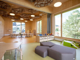 Der Anbau umfasst einen Gruppenraum mit Schlafraum und Sanitärbereich für 8 Kinder im Alter von 1 bis 2 Jahren sowie zwei Gruppenräume für insgesamt 28 Kinder im Alter von 3 bis 6 Jahren. Zusätzlich wurden Garderobenbereiche, eine Ausgabeküche und barrierefreie Sanitäreinrichtungen integriert. Neben den baulichen Maßnahmen wurden auch Außenanlagen wie Hofzufahrt, Wege, Terrassen, Spielgeräte und Einzäunung des Grundstücks gestaltet. Das Projekt verbindet funktionale Bauweisen mit einer kindgerechten Gestaltung.